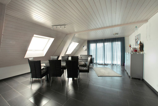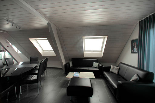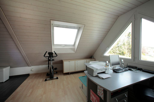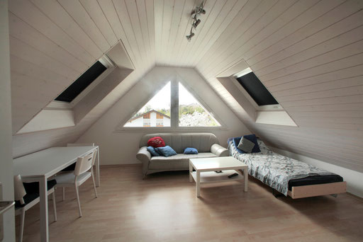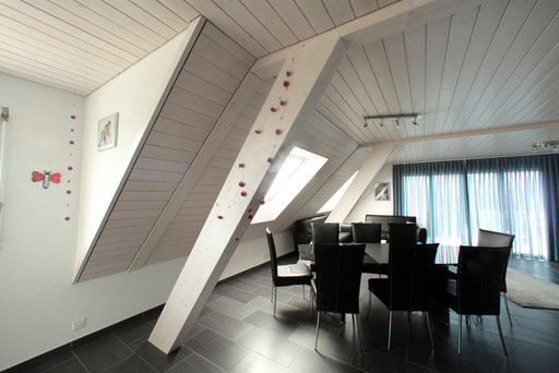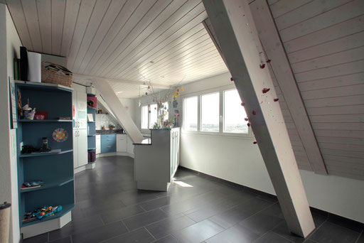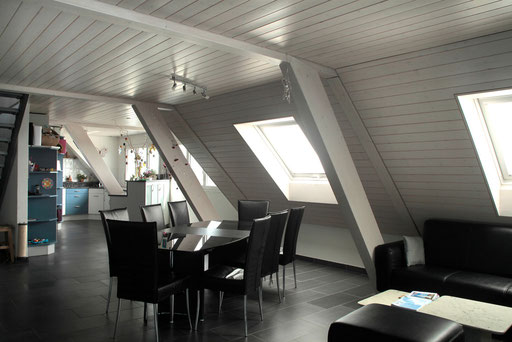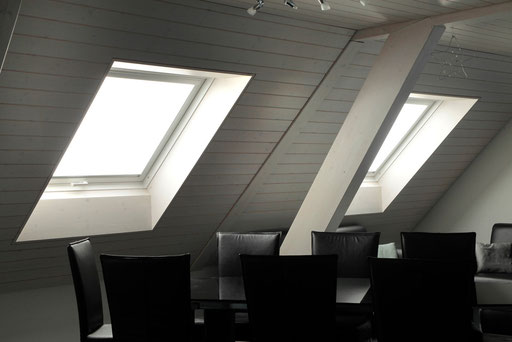 Die sichtbare Binderkonstruktion fügt sich den Räumen gut an. Durch die vielen Dachfenster, die Lukarne und das weisse Innentäfer sind die Räume hell und warm